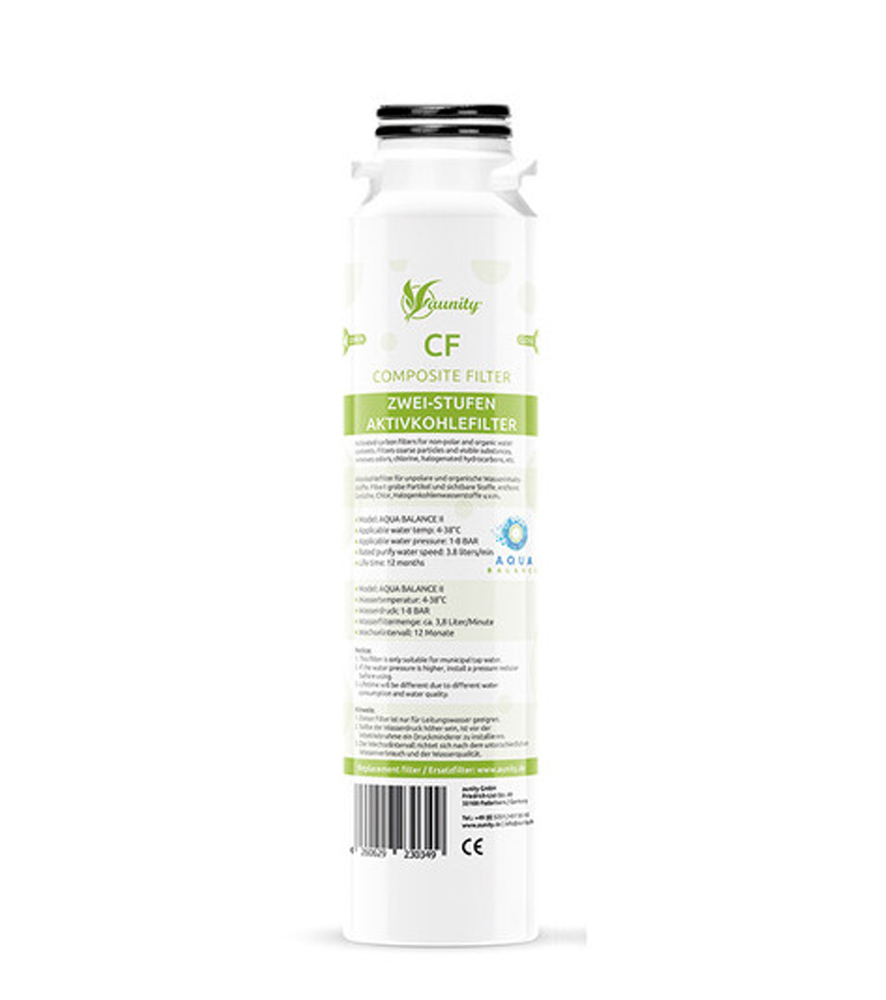 AQUA BALANCE II AKTIVKOHLEFILTER CFCF AKTIVKOHLEFILTER FÜR UNPOLARE UND ORGANISCHE WASSERINHALTSSTOFFEDiesen Filter sollten Sie in Ihrem Aqua-Balance-Filtersystem mindestens einmal im Jahr austauschen!